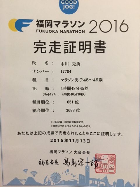 福岡マラソン2016 2016年11月14日 やっと終わったマラソン。練習の甲斐あって何とか完走はできました。達成感は充分ですが、練習のために犠牲にすることが多すぎるかな。週末は子供をみとかないといけないので、十分に練習できるのは木曜の昼です。が、その貴重な自分の時間が練習でつぶれるのが痛い。今年はバイクにも乗ってないし、釣りにも行ってないし、昼からお酒が飲めないので寿司屋や蕎麦屋にも長いこと行ってません。メディカルランナーも含めて、来年応募するかどうか、ゆっくり考えないと。サブ5だったので満足。サブ4は絶対無理。さわらぐち胃腸肛門クリニック
